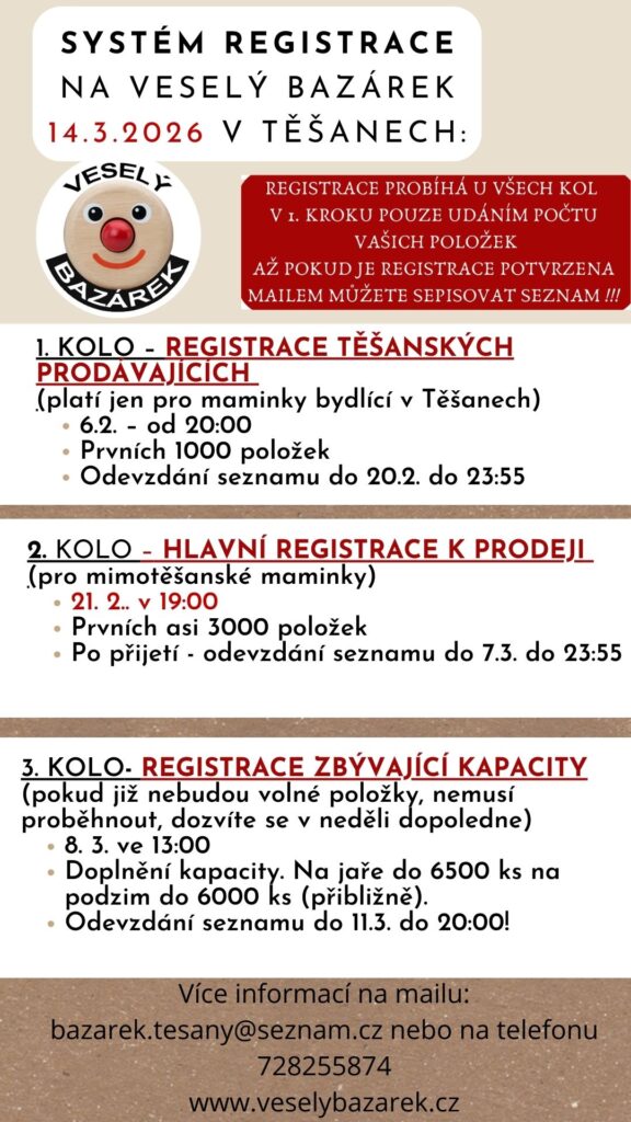 Tato registrace je nezávazná tzn. registrací do systému se neregistrujete k prodeji. Teprve poté, co projdete registrací ke konkrétnímu bazárku – viz termíny na plaátu, jste přijati sepisujete seznam a jakmile ho odešlete, teprve tehdy jste závazně přihlášena k prodeji na našem bazárku. U Těšanských maminek budeme ověřovat bydlište z nějakého dokladu.