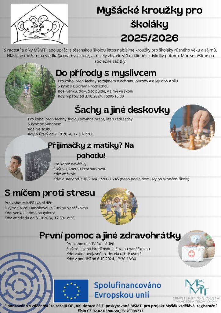 Pojď s námi trávit volný čas, ať už chodíš do těšanské základní školy nebo jinam. Letos jsme si nachystali čtyři pěkné kroužky. Všechny jsou super a všechny jsou zdarma. Přihlas se tady, nebo pod QR kódem v letáčku.